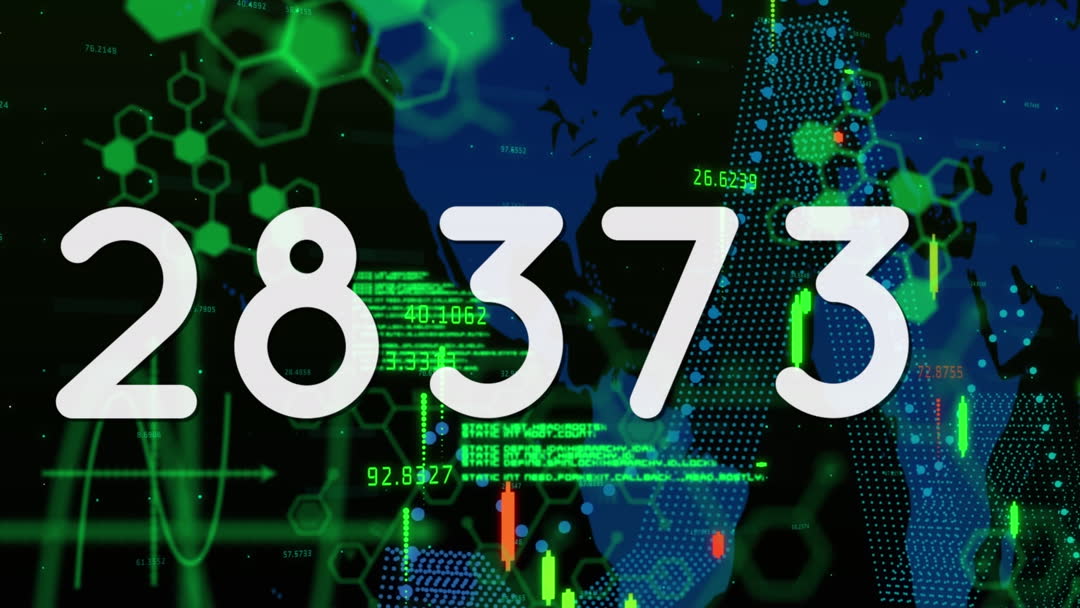 Animation displaying generative numbers and data motifs on dark backdrop ideal for illustrating themes of advanced technology, data science, or future projections. Suitable for use in presentations, tech ads, website banners about digital transformation or data analytics.