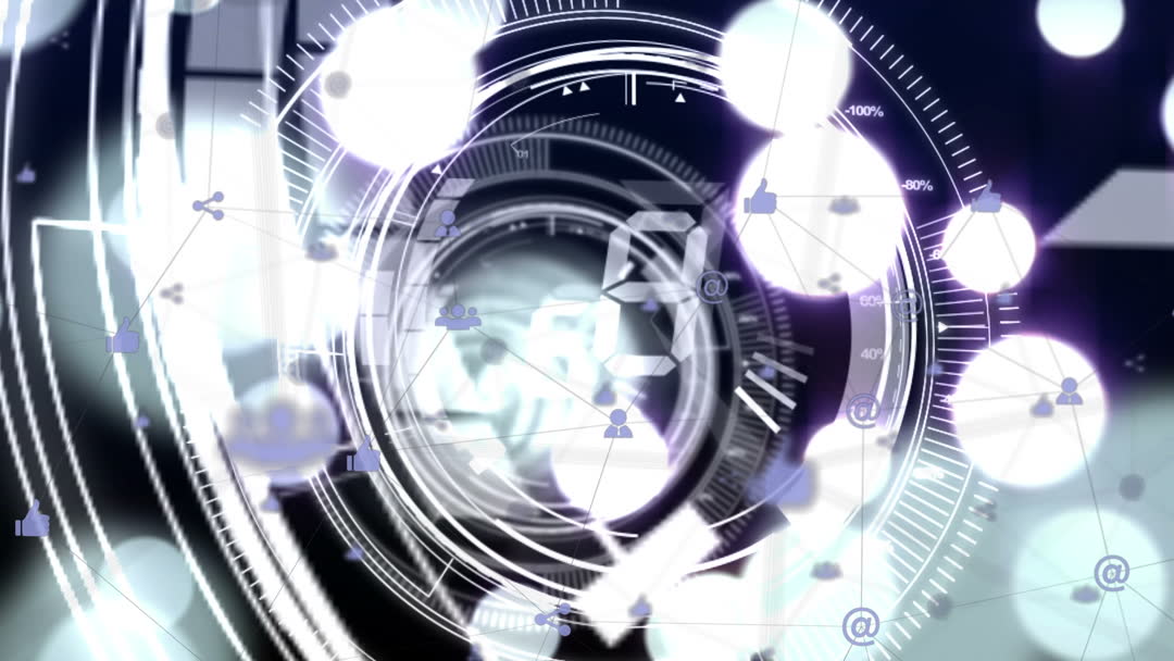 Futuristic animation overlay blends a countdown timer with dynamic connections and social media icons in a glowing digital landscape. Ideal for use in presentations related to technology, communication, and digital networking. Suitable for digital backgrounds, tech company intros, or media graphs illustrating internet connectivity.