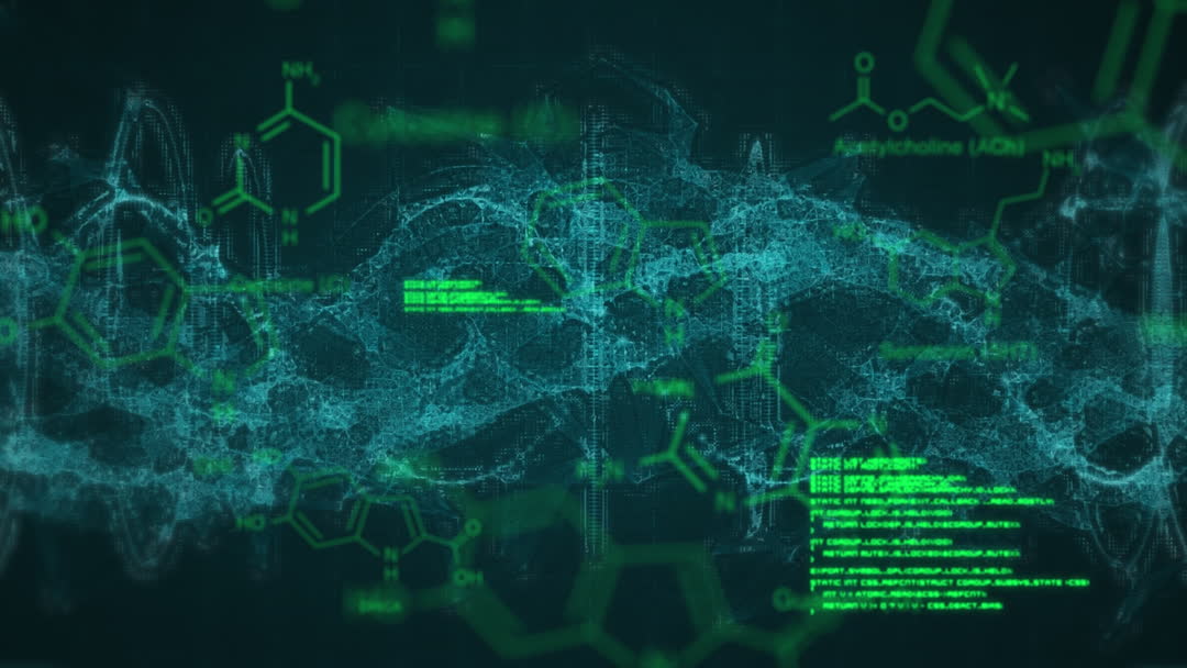 This visually dynamic representation features data processing with digital waves and molecular graphics. Best used for scientific, educational, or technical themes, perfect for illustrating concepts in research and technology sectors, including computing and biochemistry advancements.