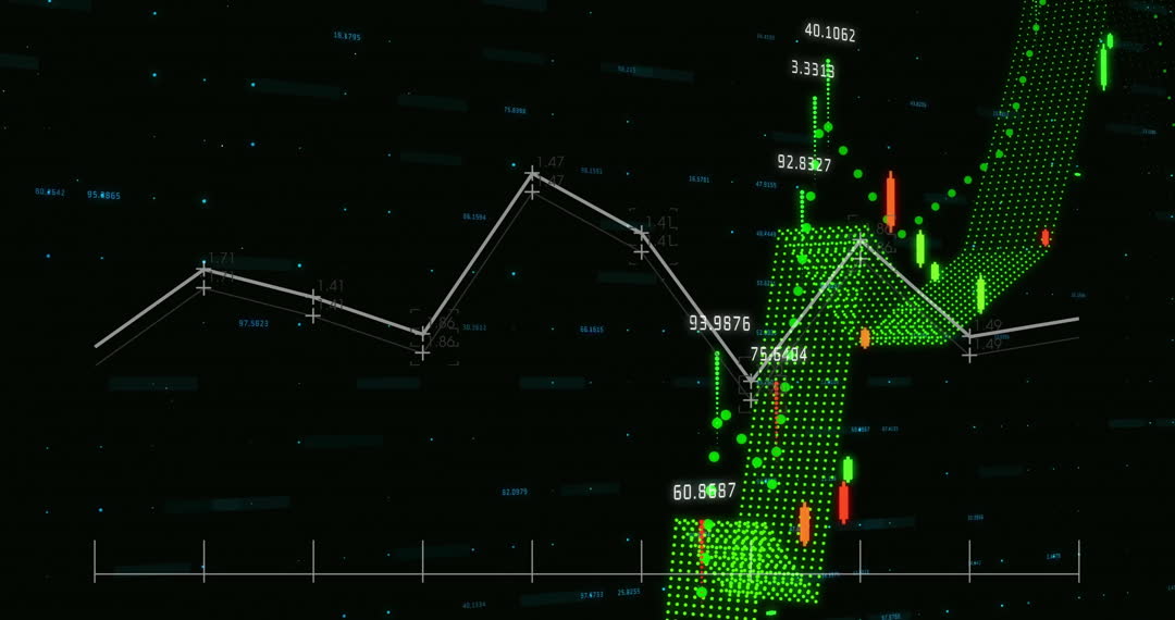 This animated scene showcases technological advancements in data processing and analytics. It features green charts and dynamic graphs on a sleek, black digital interface, making it suitable for illustrating complex concepts in presentations about finance, big data, or technology development. Use it to emphasize digital transformations in business or academic content.