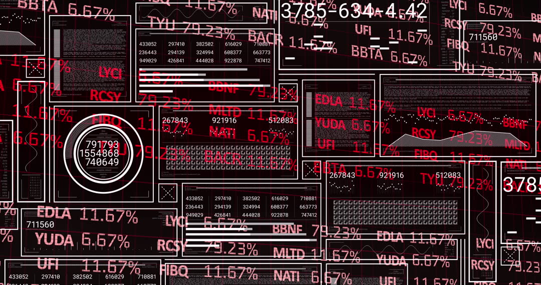 Financial data appear dynamically over a dark background, illustrating technology-driven business analytics. Red and white numeric details engage with digital patterns, echoing a futuristic finance industry. Useful for financial platforms, business consultations, or presentations involving economic trends and fiscal technologies.