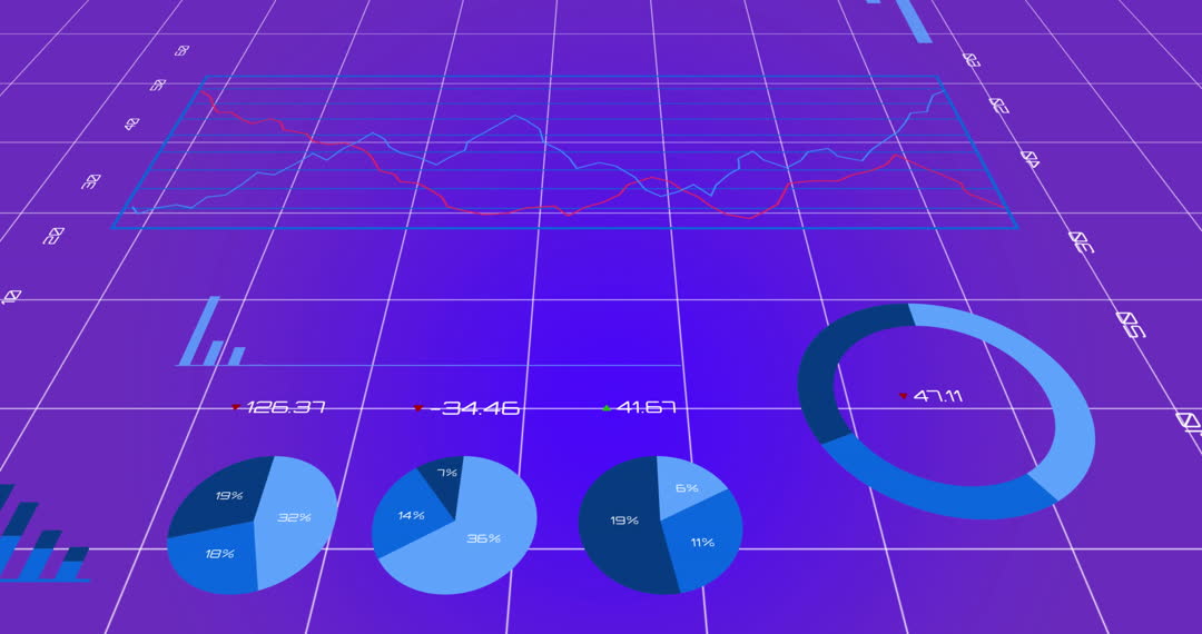 Graphic depicts various digital graphs set against a sleek purple grid background, illustrating the dynamic nature of financial data analysis. Ideal for presentations on business strategy, economic forecasting, and financial technology development. Can enhance content related to data-driven decision making and futuristic analytics tools.