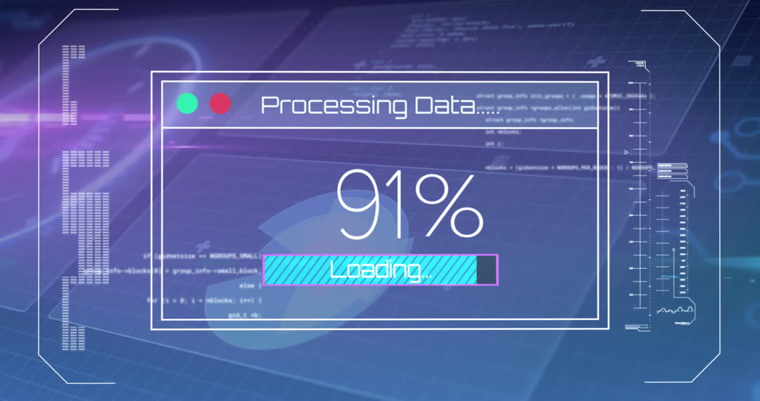 Technological digital interface displays progress bar indicating data load status at 91% attached to computing processes. Adapted to use in tech presentations, software development visualizations, or educational material detailing data processing.