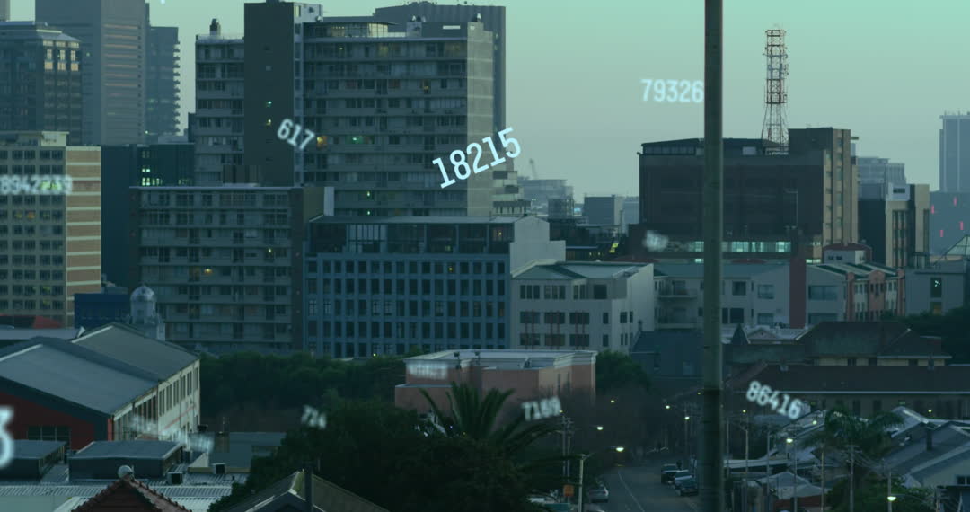 Visual emphasizes futuristic technology with dynamically changing numbers superimposed over urban cityscape, ideal for conveying digital transformation, data analysis, and modern business innovation.