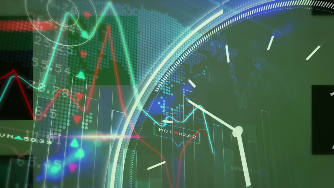 This visually engaging scene combines elements of animated DNA strands with data processing charts, conveying a sense of technological advancement and interconnected digital networks. Ideal for use in technology-related presentations, educational content about genetics, or illustrating global digital connectivity in the finance sphere.
