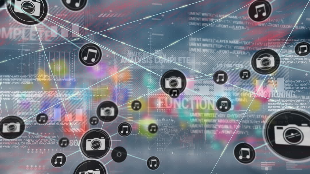 Vivid representation of interconnected digital networks highlighting data processing and media integration. Ideal for illustrating concepts related to global business, information technology, and data-driven solutions. Suitable for use in presentations discussing technological advancements and analyses in business settings.