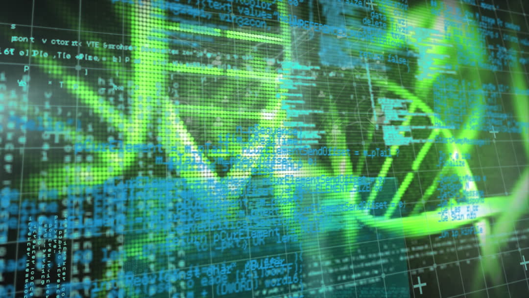 This eye-catching visual captures a dynamic view of a DNA helix overlaying digital data processing elements, embodying the fusion of genetics and technology. Ideal for illustrating themes in biotechnology, scientific research, genetics courses, medical innovations, or technology development projects.