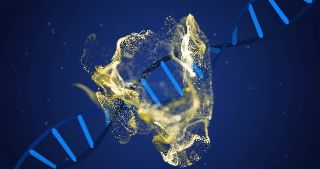 A dynamic depiction of a DNA helix intertwined with molecular structures, set against a deep blue background. Suitable for illustrating biotechnology and genetics concepts, ideal for use in scientific presentations, educational materials, biotech marketing, or promotional content for genomic research.
