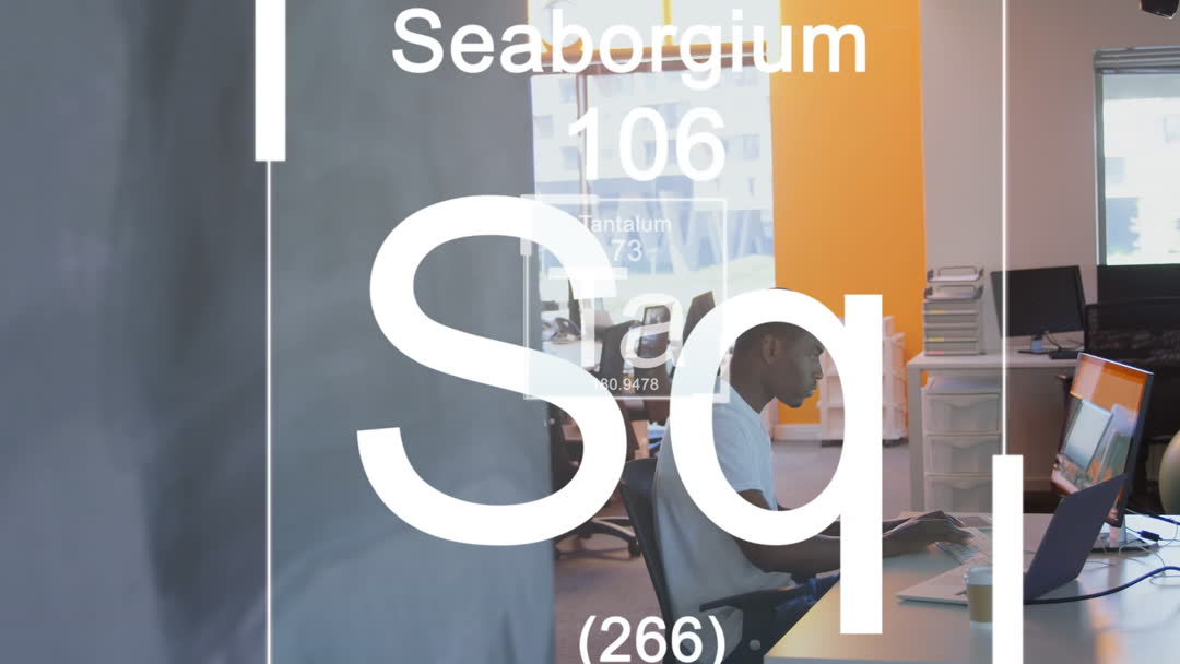 This creative video combines an animated overlay of chemical elements with a modern office environment, focusing on an African American man working on a laptop. It is ideal for use in digital marketing materials, tech-related presentations, or educational content to symbolize innovation and modernity in the workplace.