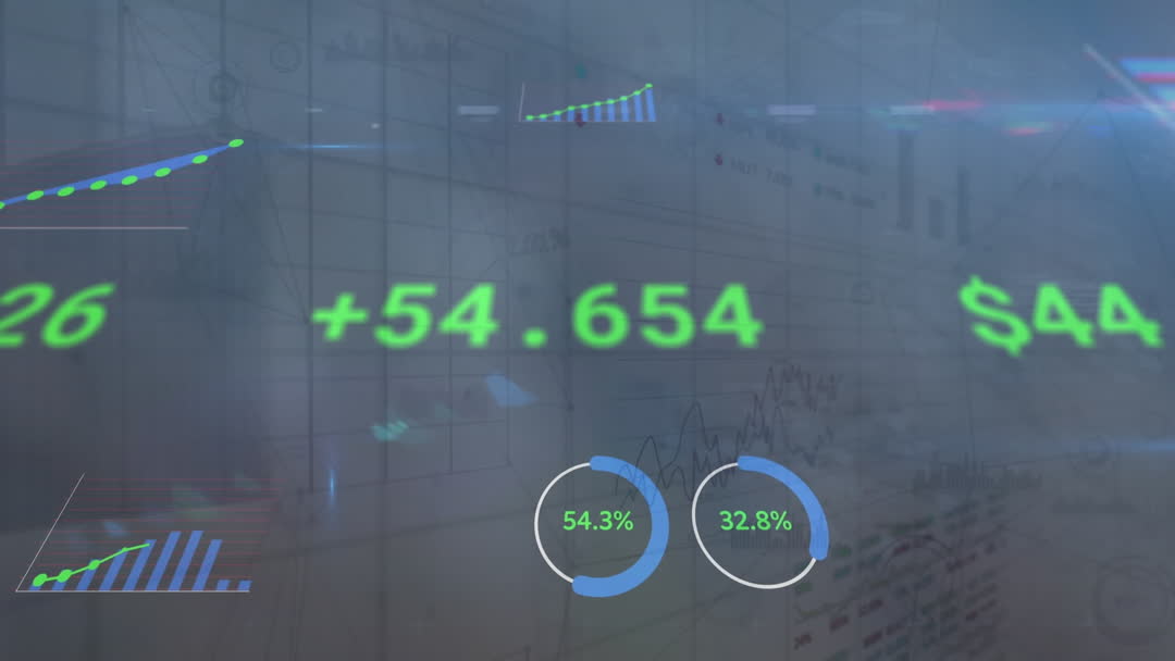 This video features dynamic financial data and processing visualization, symbolizing modern business technology and analytics. Numbers and charts hover in a digital space, suggesting concepts of financial growth and technological innovation. Could be used for illustrating finance reports, data analysis articles, or business technology presentations.