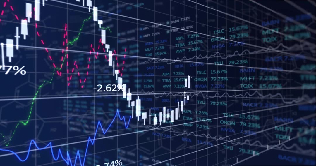 Illustration of a high-tech financial interface showcasing changing candlestick charts, financial graphs, and real-time ticker information. Suitable for illustrating investment trends, stock market studies, economic forecasting, financial services advertisements, and technology-focused finance apps. Ideal for business presentations focused on market analytics or financial strategy planning.