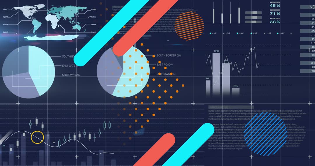 Animated visual interface showcasing financial data and analytics. Features include dynamic pie charts, scattered orange elements, and bar graphs. Ideal for presentations about financial technology, data trends analysis, or business analytics. Suitable for illustrating complex data scenarios in an engaging and visually appealing manner.