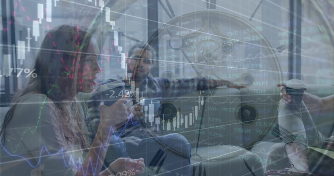 Visualizing the intersection of time and finance, this concept showcases a group of diverse professionals in an engaging office environment, superimposed with financial charts and a clock overlay. Perfect for themes of team collaboration, diversity, innovative finance solutions, business strategy, and time management in corporate settings.