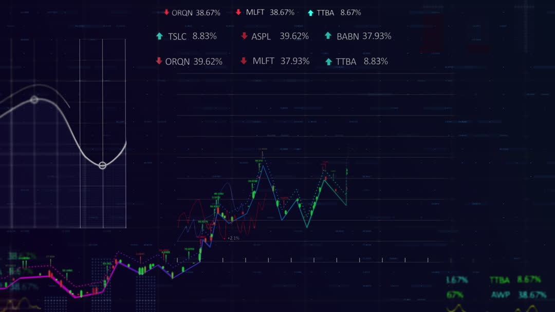 This visual represents animated financial data with elegantly designed graphs and charts. It's ideal for use in presentations about stock market trends, investment strategies, or financial education. The futuristic design appeals to audiences interested in data analysis and technology-driven insights.