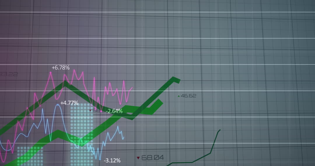 This concept video features a dynamic green line graph illustrating financial data over a grid background. The data plot includes percentages indicating market fluctuations in vibrant colors. Perfect for presentations, educational material, or articles on finance, stock market trends, or investment analysis.
