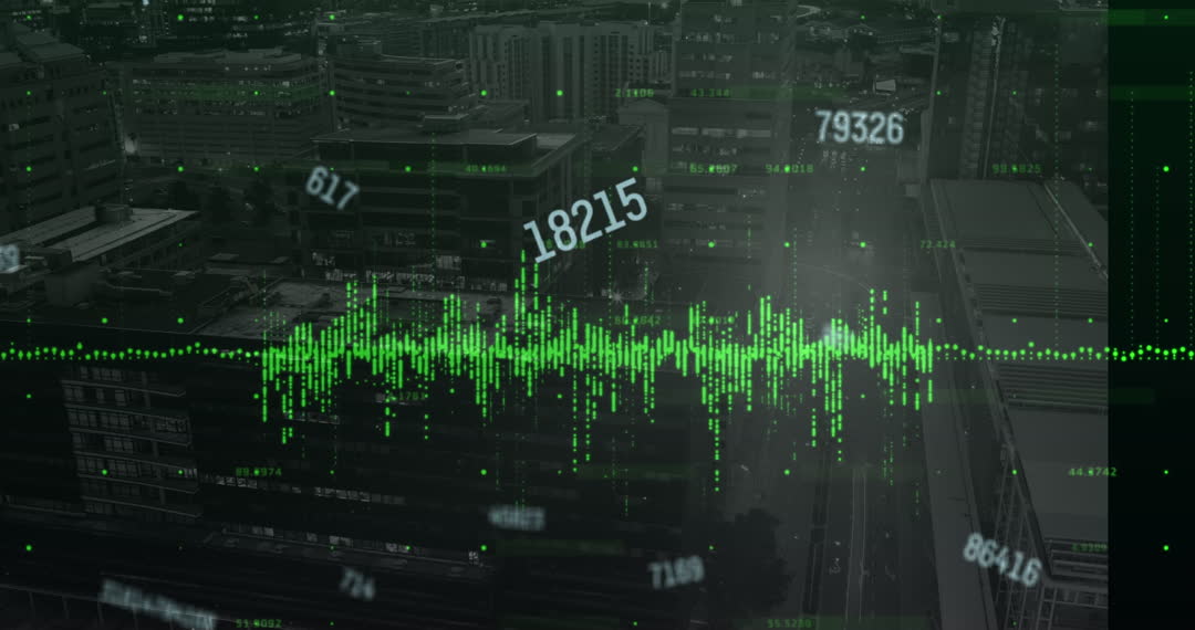 Animation highlights dynamic financial data processing with overlay on a bustling urban landscape. Concepts of advanced technology and economic analysis. Suitable for illustrating themes in global business reports, technology trends, urban development seminars, or financial market programs.