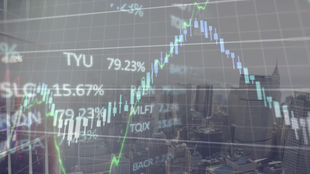 Dynamic Financial Data Overlays City Skyline Video