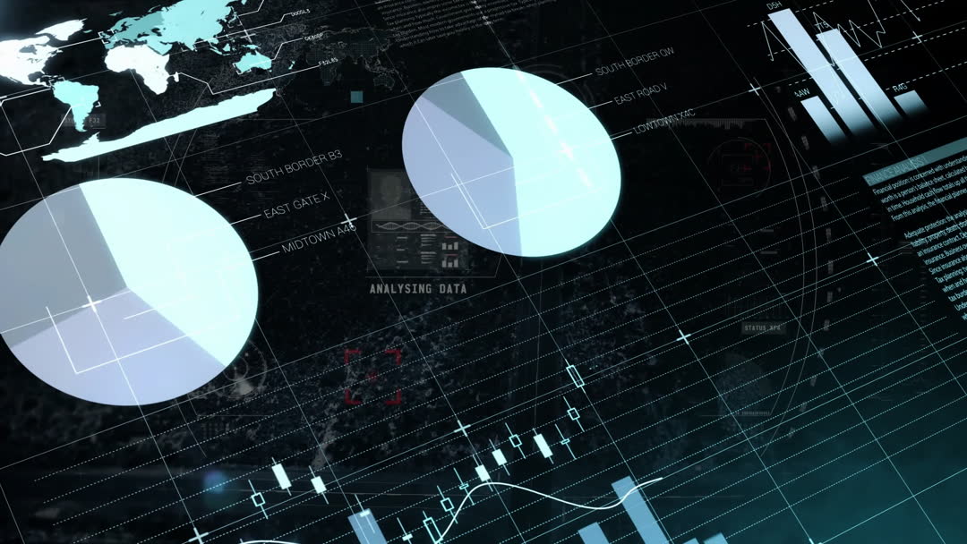 Visualizing complex financial data displayed on a futuristic, digital background. Featuring pie charts and grid overlays that simulate data processing activity in global finance settings. Ideal for illustrating technology-driven financial services, business analytics or economy-related presentations.