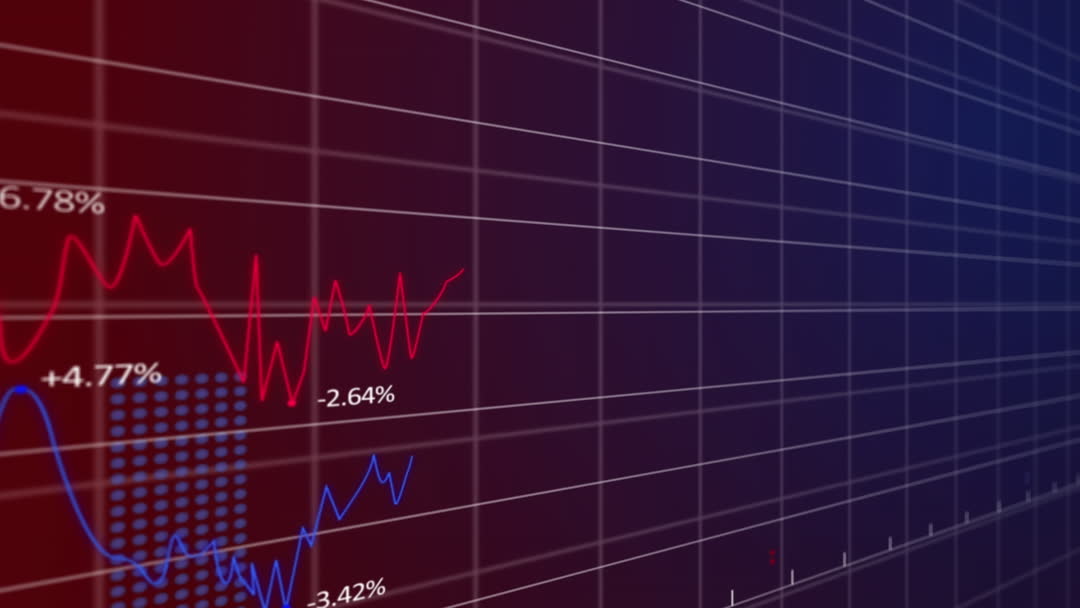 Digitally generated chart illustrating fluctuating financial data on a grid divides red and blue projections. Useful for presentations or content related to economic analysis, business forecasting, market trends, investment strategies or financial planning.
