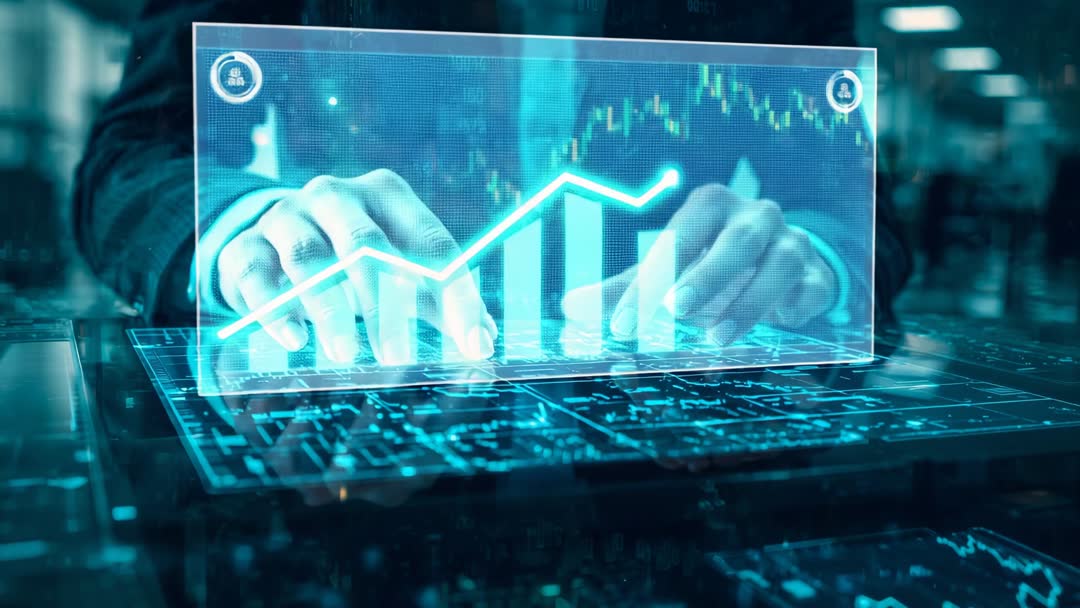AI Generated Image. This image captures interactive digital analysis with hands tapping on an advanced display showing growth trends and increasing bars. Ideal for use in technology blogs, presentations on financial innovation, or articles focusing on data analytics in corporate settings. Enhances visual themes of modern business intelligence, AI integration, and futuristic solutions in finance.