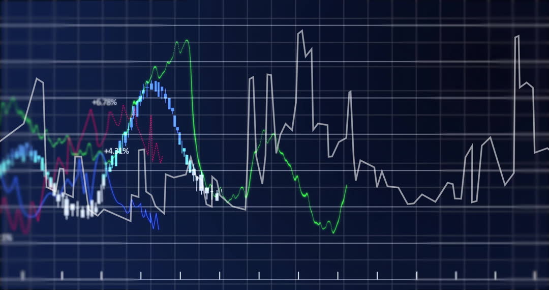 This visual represents dynamic financial data depicted through an animated graph, showcasing various economic trends with lines in different colors against a black background. Ideal for illustrating concepts related to global finance, stock market analysis, and digital data processing. Useful for business presentations, financial reports, and educational purposes teaching economic analytics.
