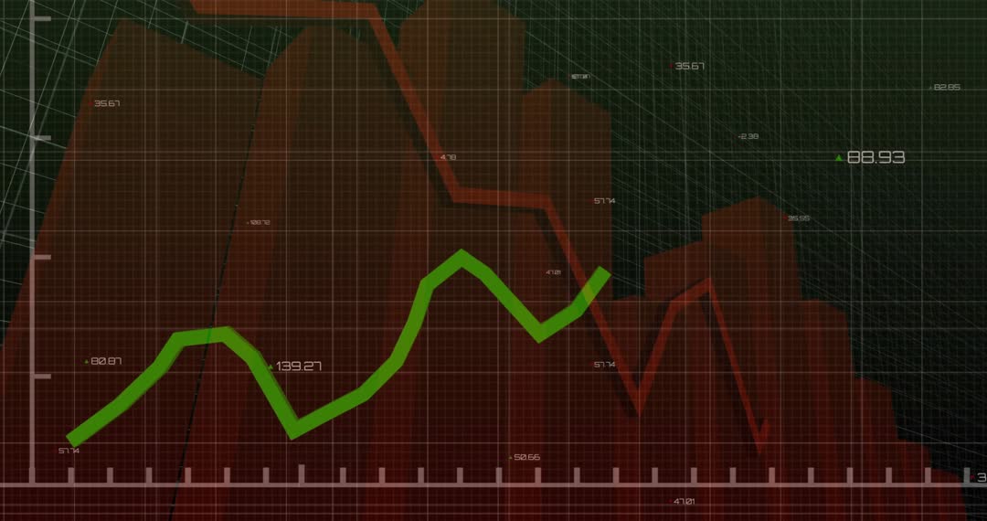 Digital presentation of financial analytics features red translucent bars and a prominent green line graph, ideal for illustrating financial trends or economic growth. Perfect for use in finance presentations, business reports, or investment analysis articles highlighting key movements in performance metrics. Suitable for technology companies focusing on data-driven solutions.