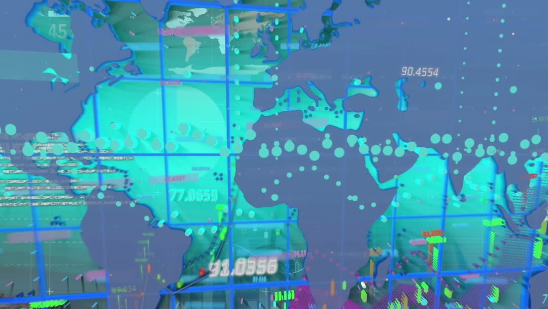 Animation featuring layered financial data processing projections over a world map. Shows digital displays of numbers and graphs, highlighting international trade and technological integration in global finance. Useful for illustrating global market updates, financial reports, and technological advancements in economic sectors.
