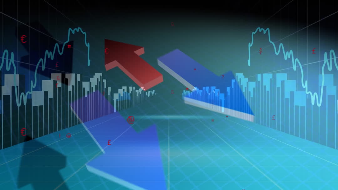 Visualization of animated financial data with upward and downward arrows showcasing dynamic shifts in economic performance. Perfect for presentations on market analytics, stock exchange updates, or business finance strategies. Use in educational videos about economics or finance industry insights.