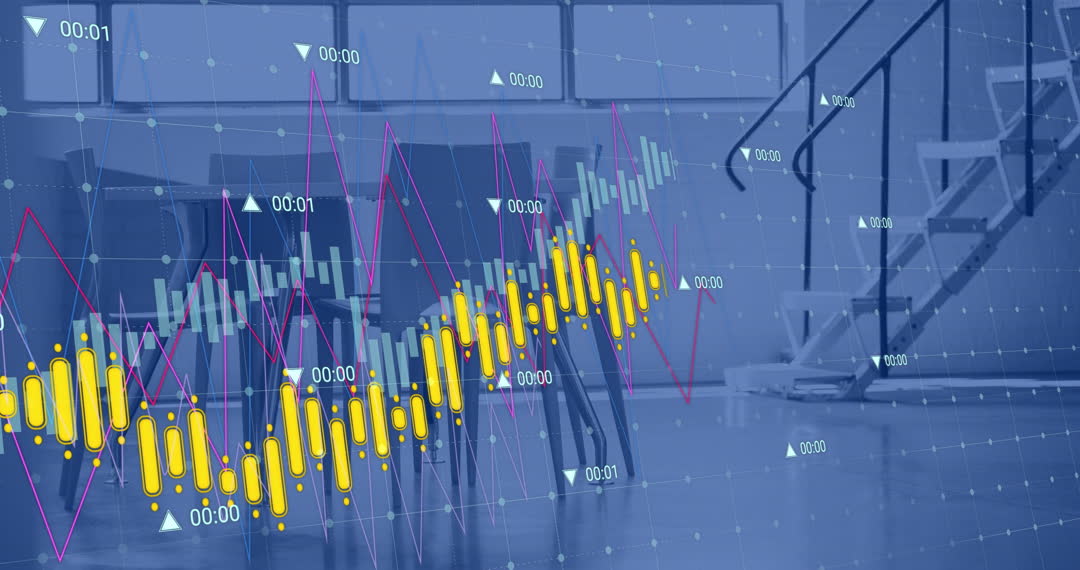 Financial graphs and numerical data overlaying an empty office, symbolizing technological advancements in business analytics. Perfect for illustrating themes related to economics, business forecasting, and the impact of technology on work environments.