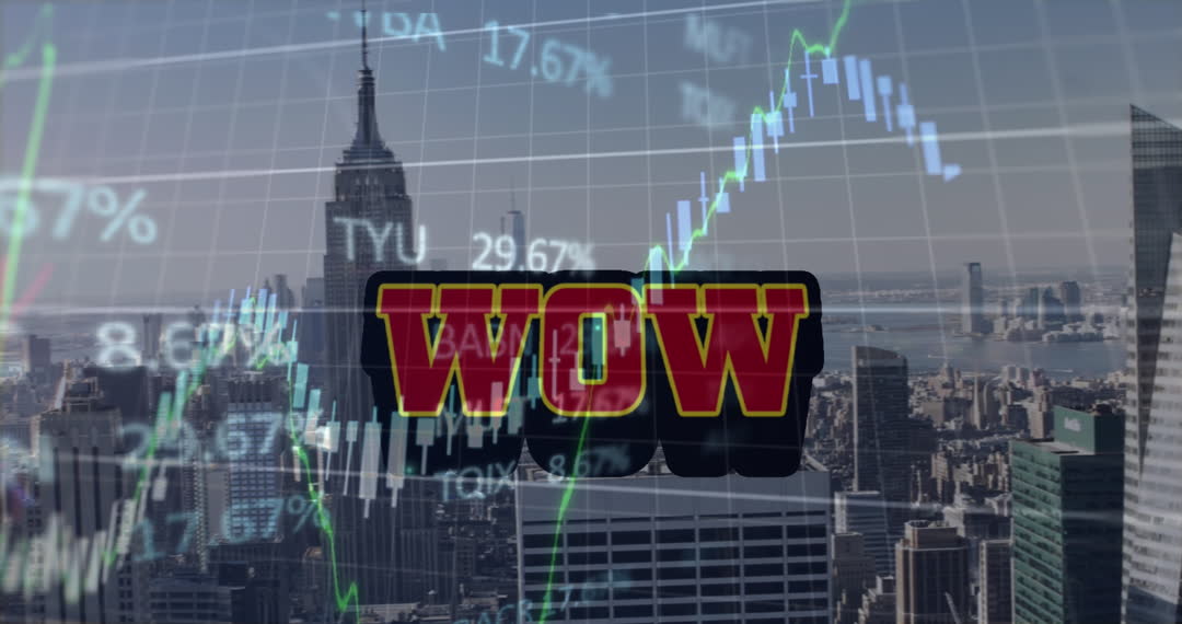 This digital video creatively overlays dynamic financial graphs with the iconic New York City skyline, highlighted by a bold' 'WOW' text at the center. The scene symbolizes trends and reactions in global finance, making it useful for business-themed content, stock market analysis articles, economic forecasts, or promotional materials for financial services and consultation.