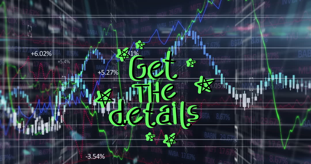 Vibrant animation featuring intricate financial graphs overlaid with whimsical 'Get the details' text adorned with stars. Suitable for financial presentations, web design, marketing materials surrounding investments, conferences on digital economics, or multimedia projects focused on finance and technology.
