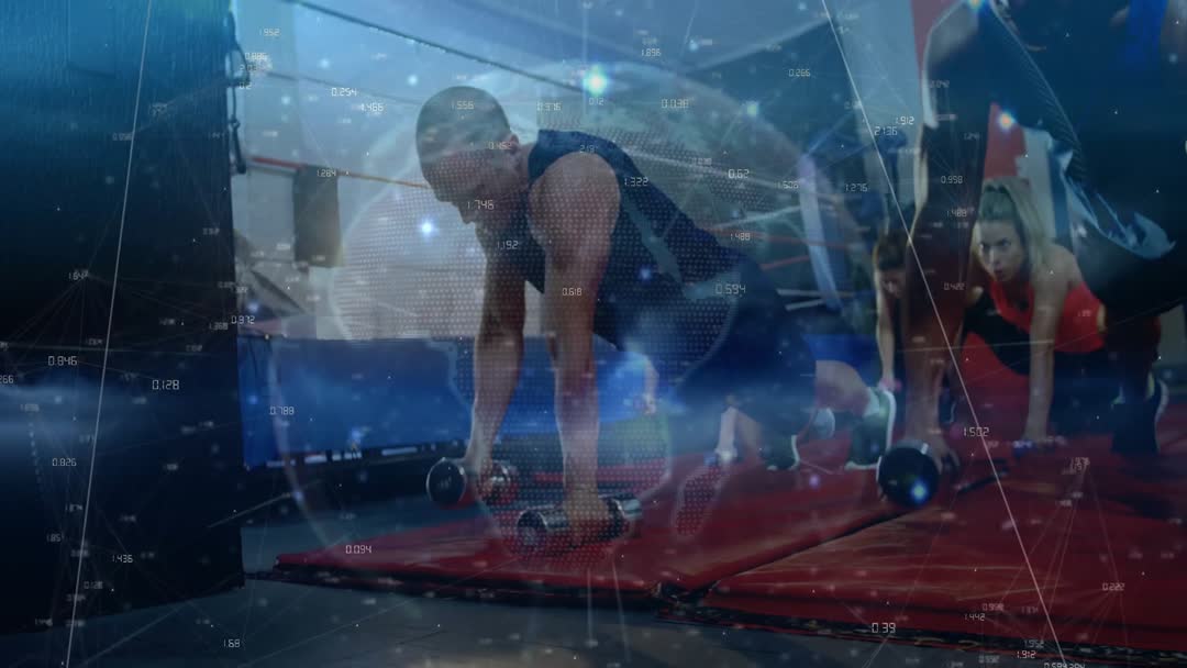 A fitness duo is featured while performing alternating dumbbell rows from a plank position. Technology-infused metrics overlay symbolize modern, professional training. Perfect for illustrating advanced gym sessions, interactive fitness apps, health promotion campaigns, and modern athletic workouts.