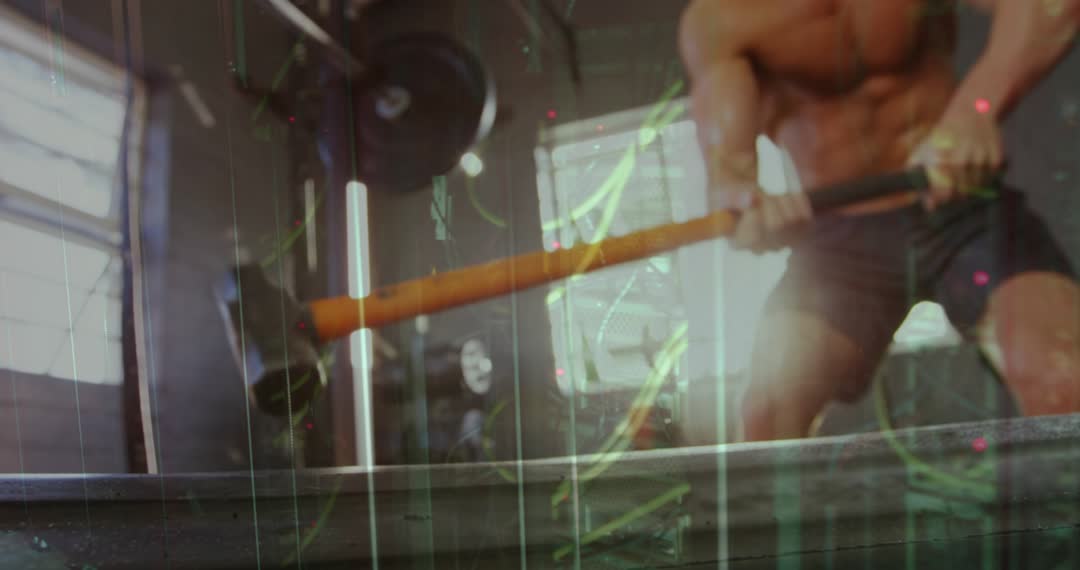 Video captures muscle-bound athlete gripping sledgehammer and forcefully swinging it onto exercise platform. Green overlay effects illustrate intensity and dedication needed for endurance workout typical in strength training. Strong visual choice for projects themed around fitness centered around power and athletic determination.