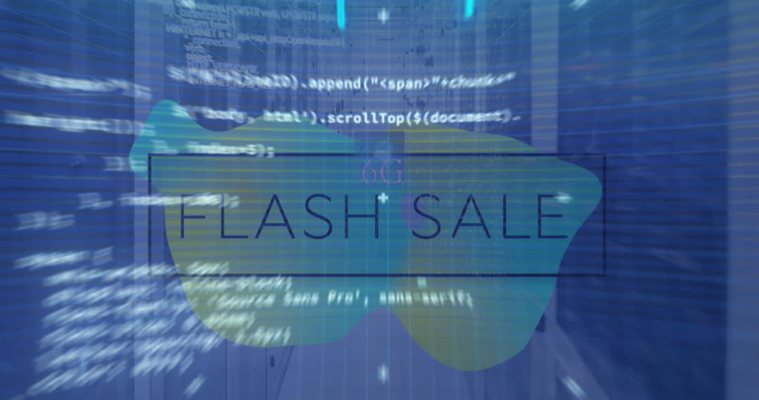 Animation displays dynamic 'Flash Sale' text over a colorful gradient banner, layered with data processing graphics and a blurred view of a computer server room. This representation captures the integration of online retail with advanced technology. Ideal for promoting sale events, digital ads, modern retail marketing strategies, and emphasizing the technological aspect of internet sales.