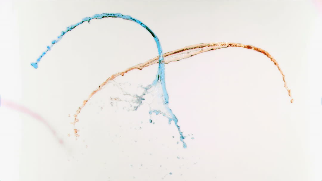Bright blue and orange liquids create an engaging splash effect in mid-air against a white backdrop. Captured in super slow motion, this dynamic view highlights the intricate details and fluid motion. Ideal for use in design projects, advertisements, or artistic displays requiring vibrant and dynamic videory.