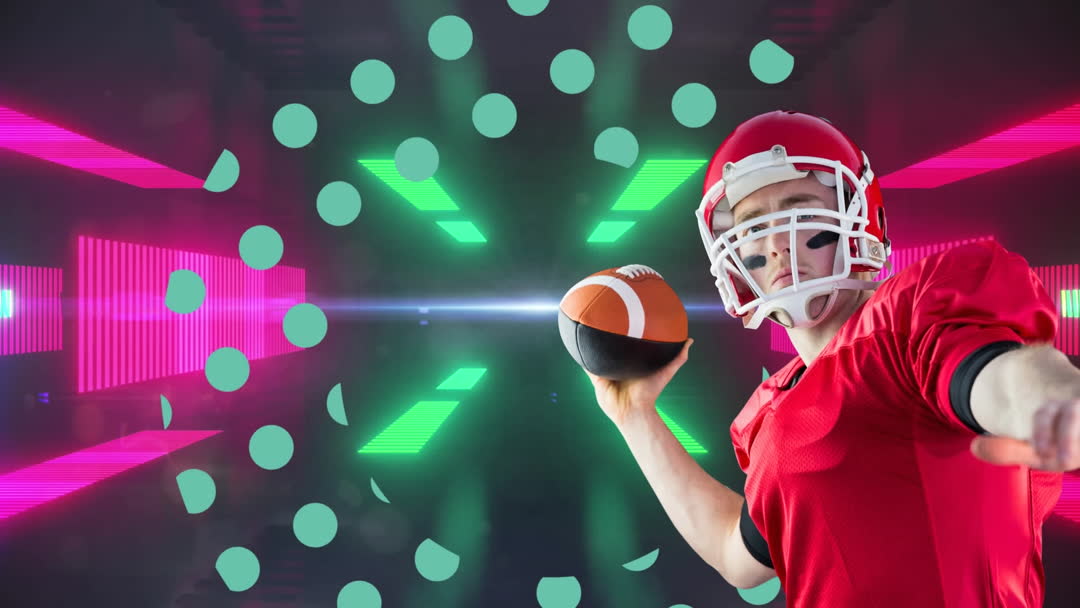 Image depicts a football player poised to throw a superimposed American football, set against a vibrant, futuristic background with neon lights. This visual can emphasize themes of sports technology, athlete performance, or sports graphics design. Suitable for promoting athletic events, sports science articles, or technology in sports marketing material.