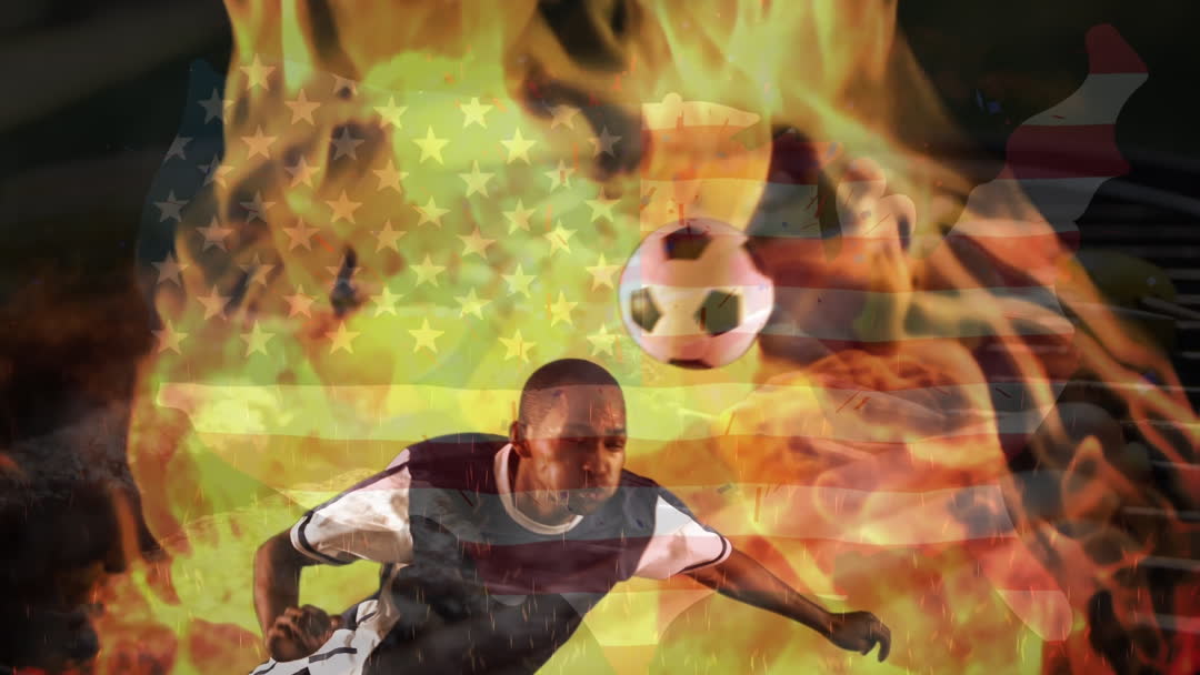 Imagery shows an athlete kicking a soccer ball, interlaced with fiery visuals and an American flag suggesting passion, dynamic movement, and competitive spirit. Suitable for content focused on sports events, promotional materials, or motivational visuals celebrating athletic excellence and national pride.