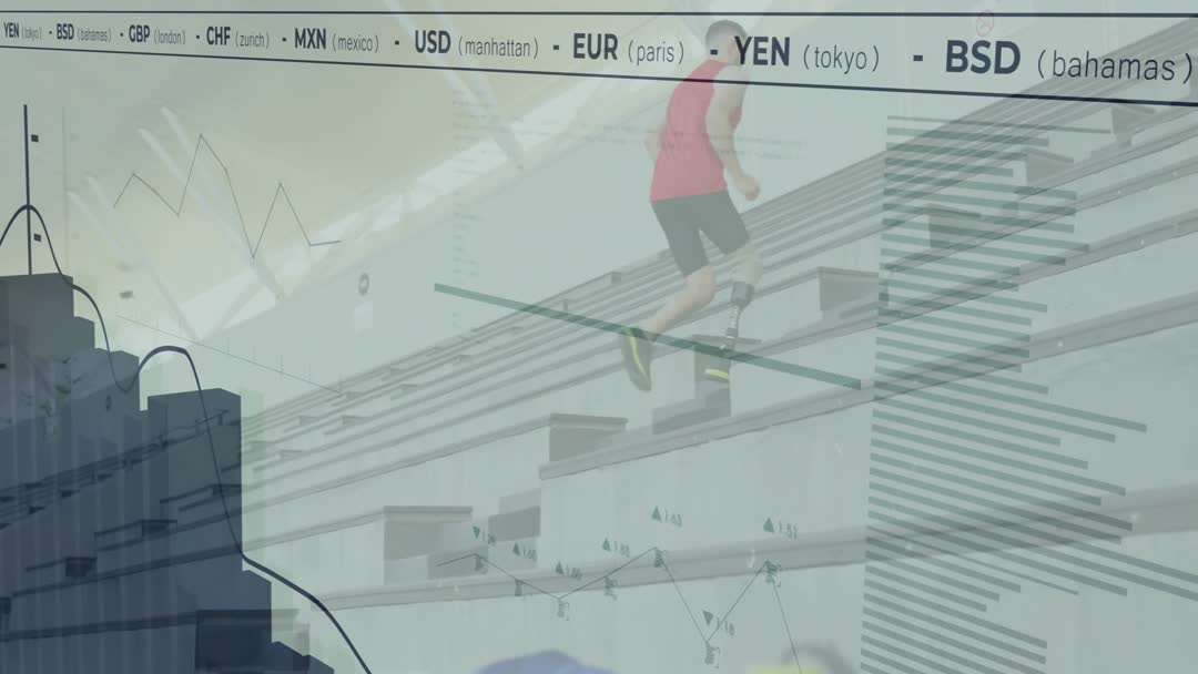 This video depicts a male athlete determinedly running up steps with a prosthetic running blade overlaid on fluctuating financial charts and stock tickers. Vibrant displays of market data symbols merge with the athlete's physical determination, symbolizing a connection between perseverance in sports and the dynamic nature of financial markets. This composition is ideal for themes centered around motivation, analytics, sports and finance technology projects, illustrating perseverance and adaptability in ever-changing environments.