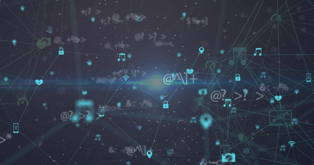 Graphic illustrating digital connectivity with various symbols overlaying global structures. Suitable for presentations on technology, networking, and global communication. Useful for advertisements in tech industries and educational materials demonstrating abstract data exchange concepts.
