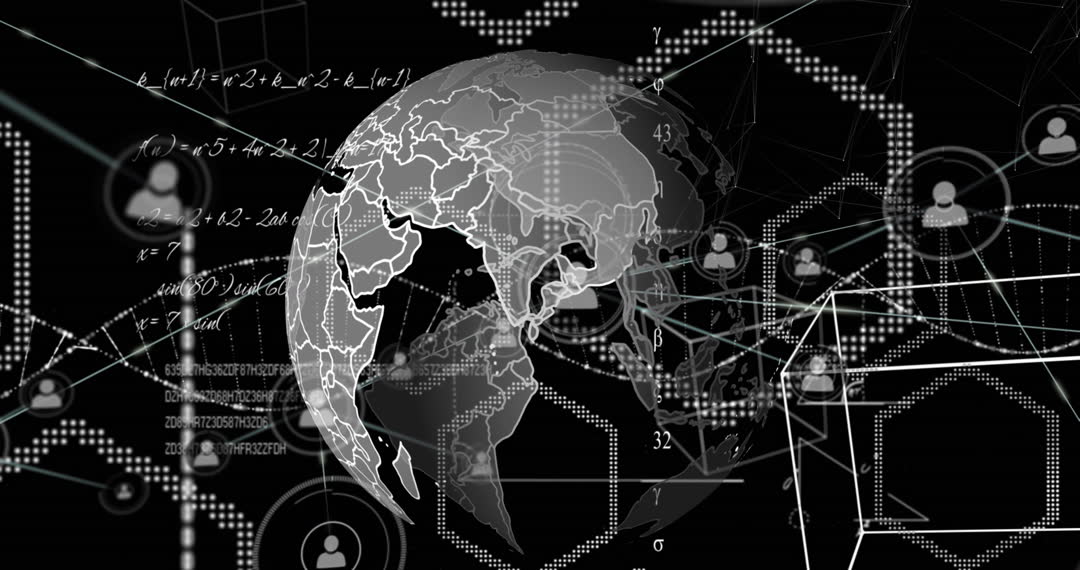 A dynamic illustration depicts interconnected profile icons and mathematical equations overlaying a spinning globe. This design symbolizes global networking and emphasizes innovation and connectivity in technology and business fields. Ideal for educational content, global communication concepts, or business visualizations on connectivity and technological progress.