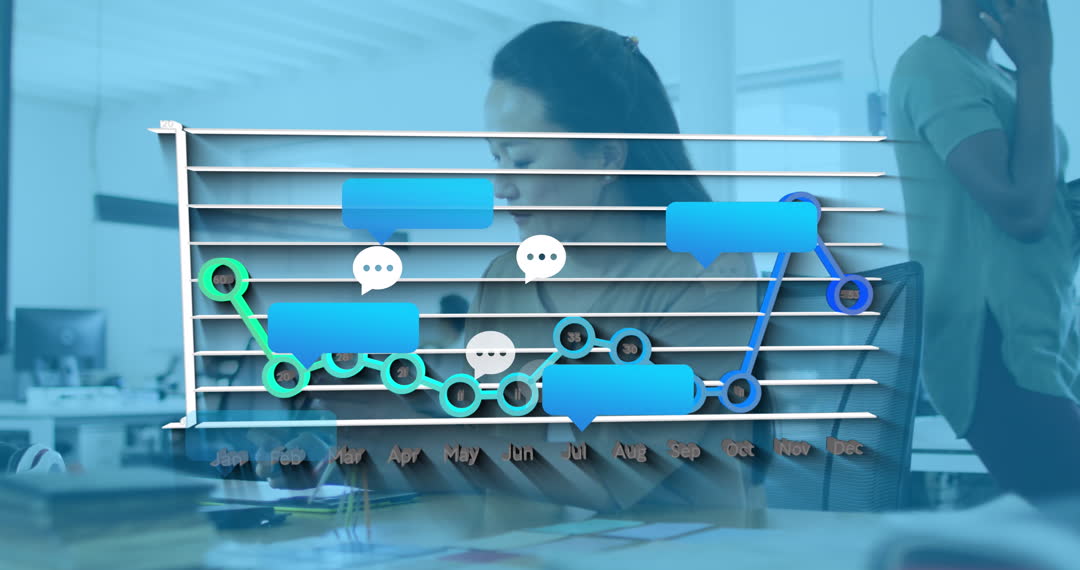 Image depicts a modern office environment with a layered digital graph overlay, showing conversation boxes and connections over a businesswoman at work. Illustrates concepts like digital communication, business analytics, social media trends, and collaborative work. Useful for conveying analysis, data exchange, technology integration in workplaces, business reports, or digital marketing materials.