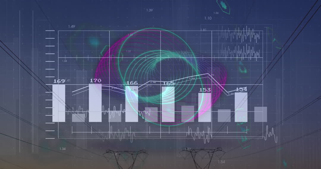 This visual combines technical graphs and charts seamlessly integrated over an video of transmission towers against the evening sky. Ideal for illustrating energy industry reports, business data analytics, and technology developments, this representation highlights the convergence of technology and energy sectors. Use in presentations, reports or marketing materials focused on innovative data solutions in energy distribution.