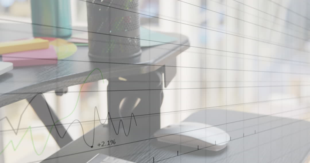 Visual depicting overlay of dynamic graphs over a desktop office setting. Suitable for illustrating concepts of business growth, data analysis, finance reports, and technological advancements. Useful for corporate presentations, financial analyses, or marketing materials discussing trends or business success.