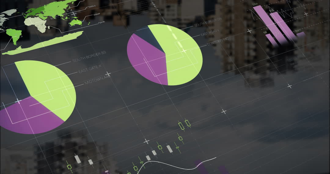 Graphic shows multicolored pie charts and analytics interfaces overlaying a cityscape. Useful for illustrating modern business reporting, technological innovation, financial forecasting, data science, and urban development themes. Perfect for use in presentations, websites, and educational materials focused on growth and technology.
