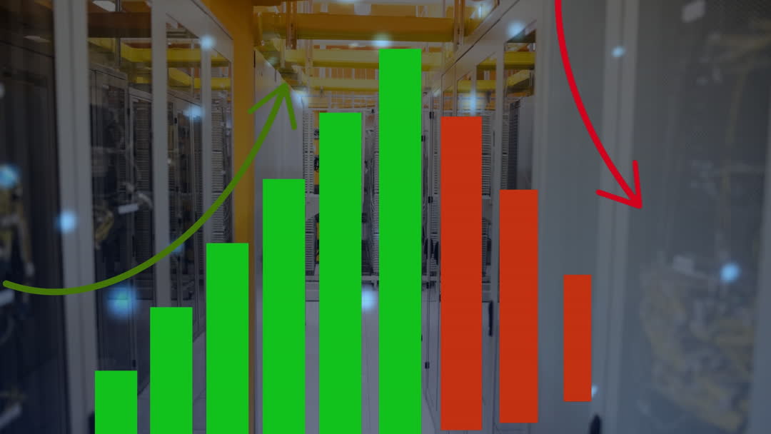 This video portrays a data-driven environment with overlay of graphs illustrating growth and decline, suitable for presentations on network infrastructure, global commerce, or data analysis trends.