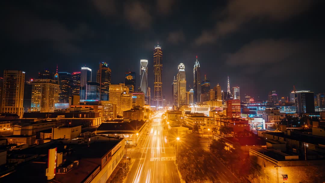 AI Generated Image. Capturing vibrant light trails from passing vehicles, this scene epitomizes the vitality of urban nightlife. The illuminated skyscrapers provide a modern and atmospheric backdrop, highlighting the city's architectural marvels under drifting clouds. This dynamic footage is ideal for projects involving city living, modern architecture, or atmospheric urban experiences packed with vibrant energy.
