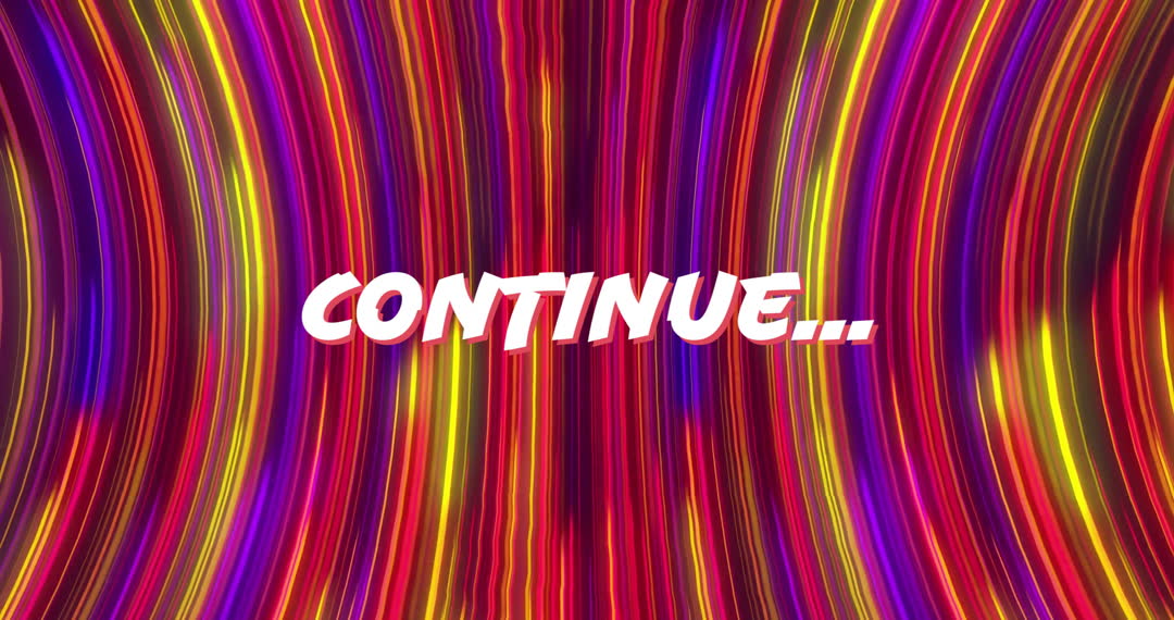 Vibrant light trails form swirling patterns with 'Continue' text overlaying, used particularly in digital contexts such as video games, websites, or multimedia presentations. Suggested use includes digital backdrops, enhancing presentations, videos, or UI designs where energetic and modern visuals engage audiences and encourage progress.