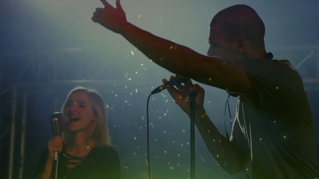 - Dynamic Live Duet: Male Lead Singing into Mic with Female Vocalist Duetting in Backlit Fog