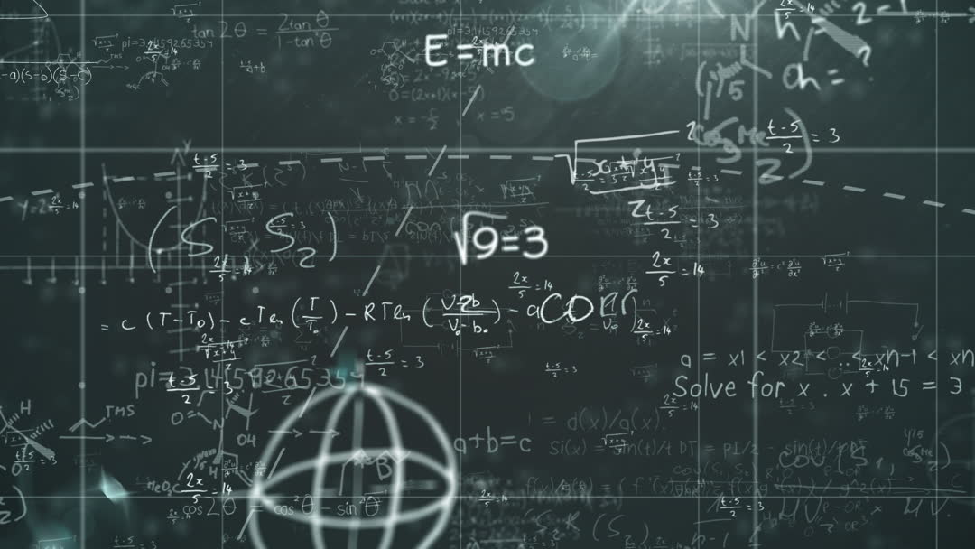 Visual of complex mathematical formulas moving across a digital grid. Useful for educational content focusing on mathematics or physics, scientific documentaries, research journals, and presentations depicting the mystery and power of numbers and scientific calculations.