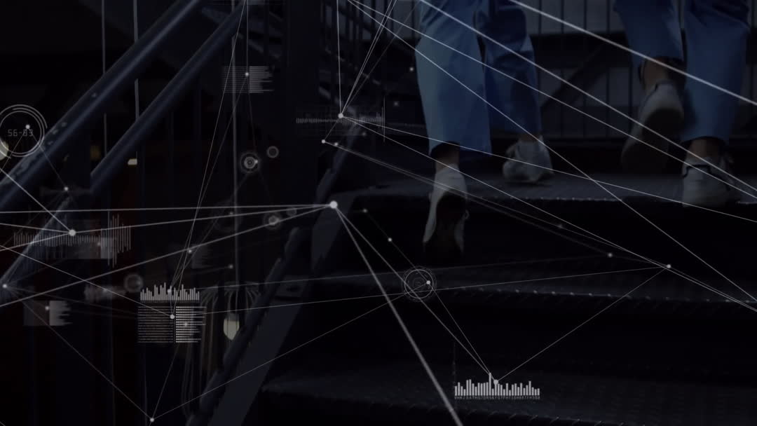 Healthcare professionals appear to be running up stairs in a futuristic or high-tech environment, overlaid with graphics of data processing and network connections. This conveys concepts of urgency, teamwork, and advanced medical technology. Ideal for use in presentations about cutting-edge healthcare solutions, teamwork in medical fields, or showcasing technological advancements in medicine.